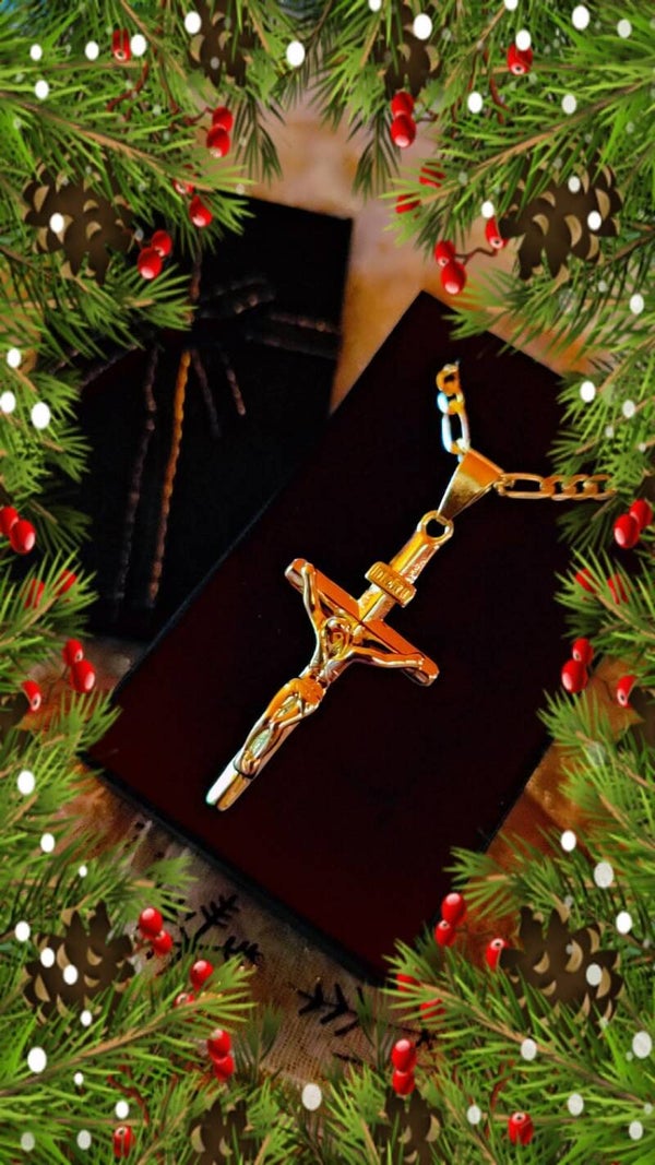 Magnifique Chaîne avec Pendantif Croix de Jésus Fait en Cuivre Plaqué Or 14 Karat.